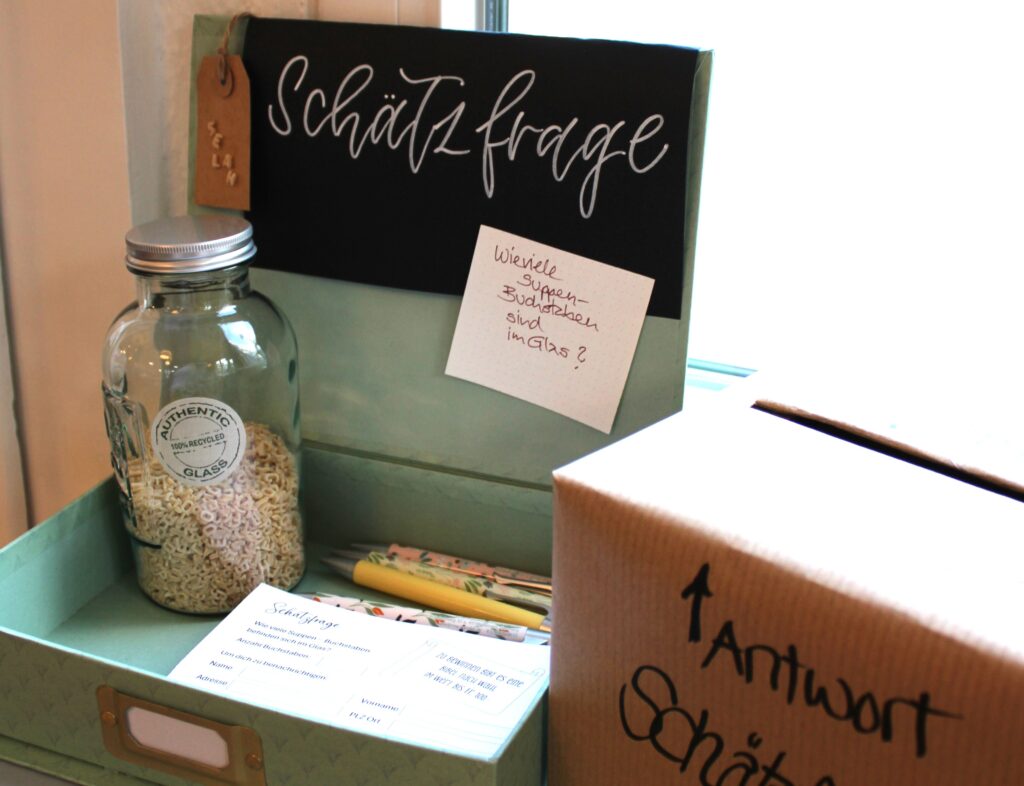 Fast alle Besucher haben gerätselt und diskutiert, um die Schätzfrage der Eröffnung zu lösen. Wie viele Buchstaben befinden sich im Glas?