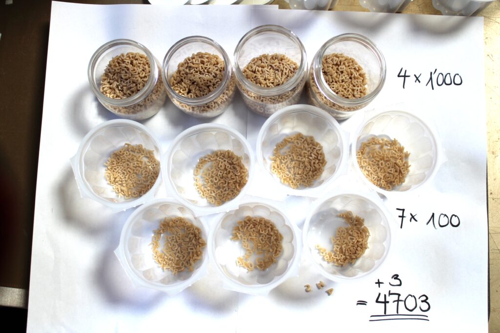 Die Auflösung lautet: Es waren 4’703 Buchstaben im Glas. Es gab zwei Gewinner/innen die mit derselben Schätzung am nächsten dran waren: 4567. Wir gratulieren den beiden und freuen uns, wenn ihr eure Bibel aussuchen kommt.